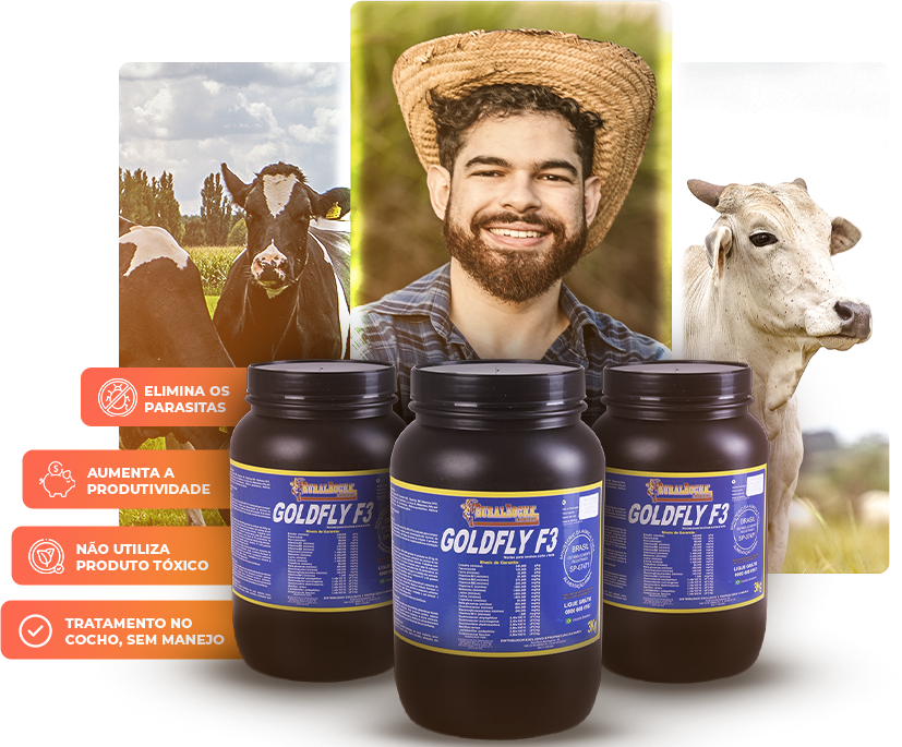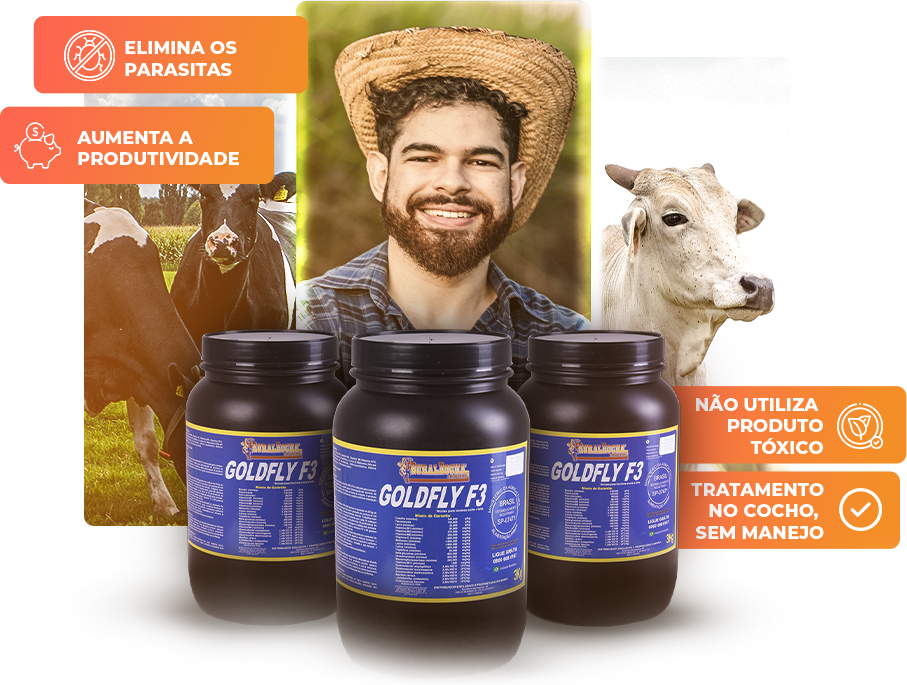 Com o uso do Goldfly, é possível eliminar moscas, carrapatos e verminoses internas, interromper o ciclo reprodutivo dos parasitas e melhorar a saúde e a fertilidade do rebanho, garantindo mais produtividade e lucratividade para o seu rebanho.